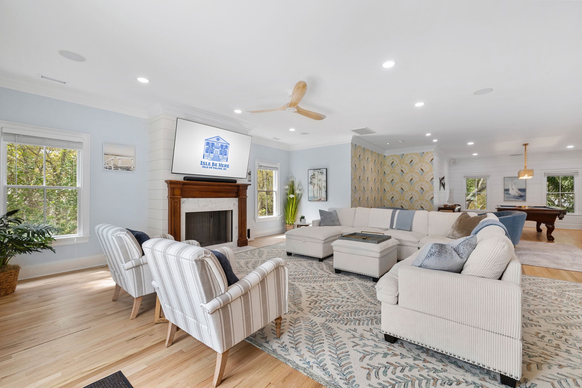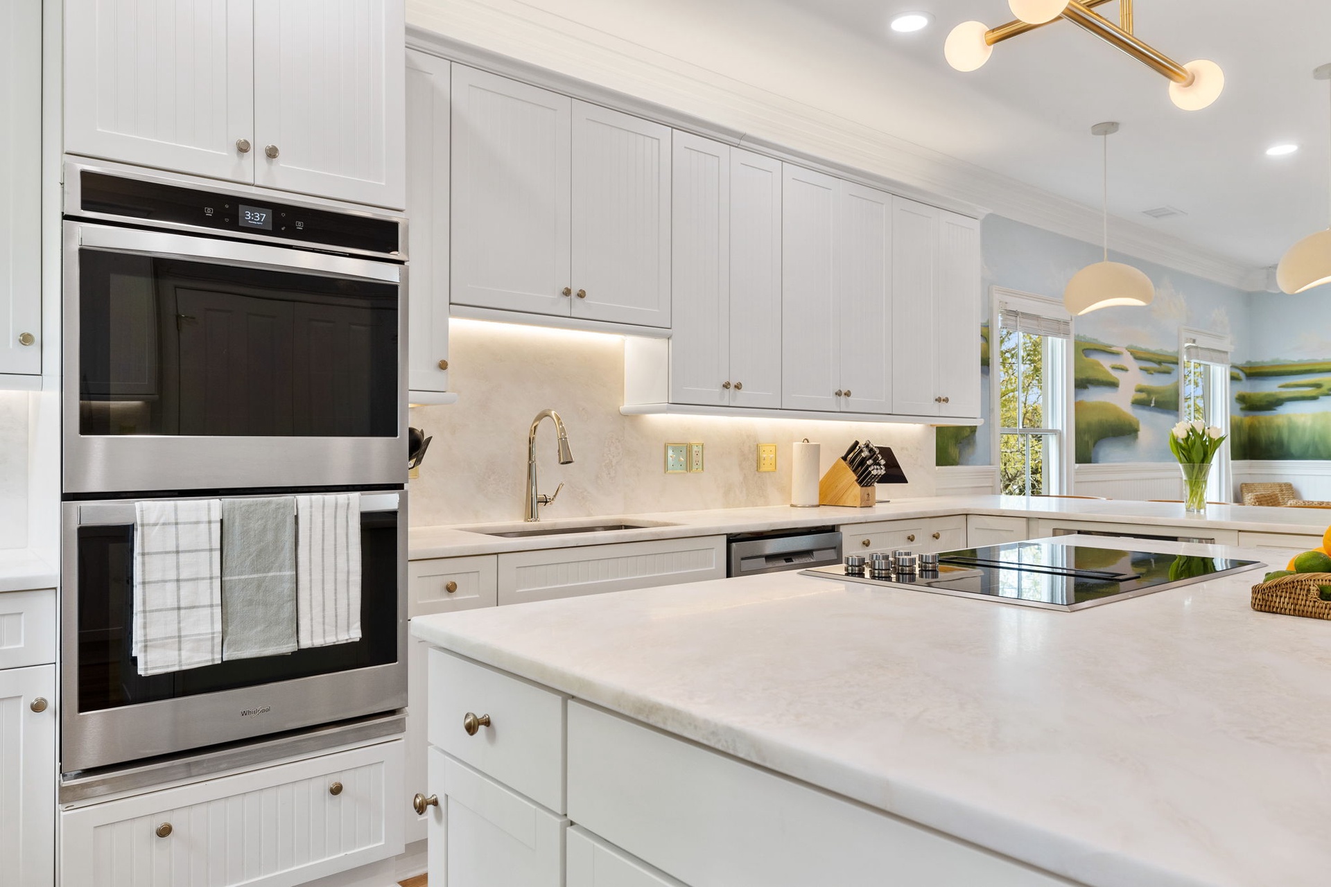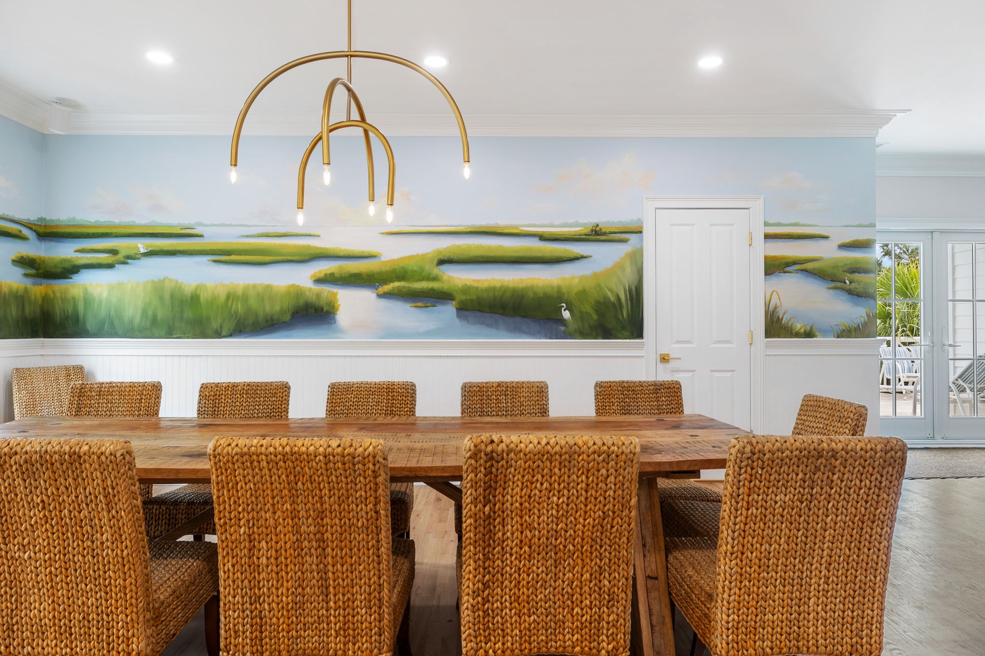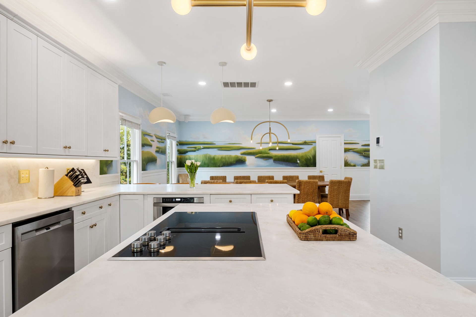 At the heart of the home, a stunning kitchen with marble countertops opens into expansive dining and living areas, anchored by a hand-painted Lowcountry mural inspired by the marsh landscapes of the island. Every space is designed to feel both connected and comfortably spacious.