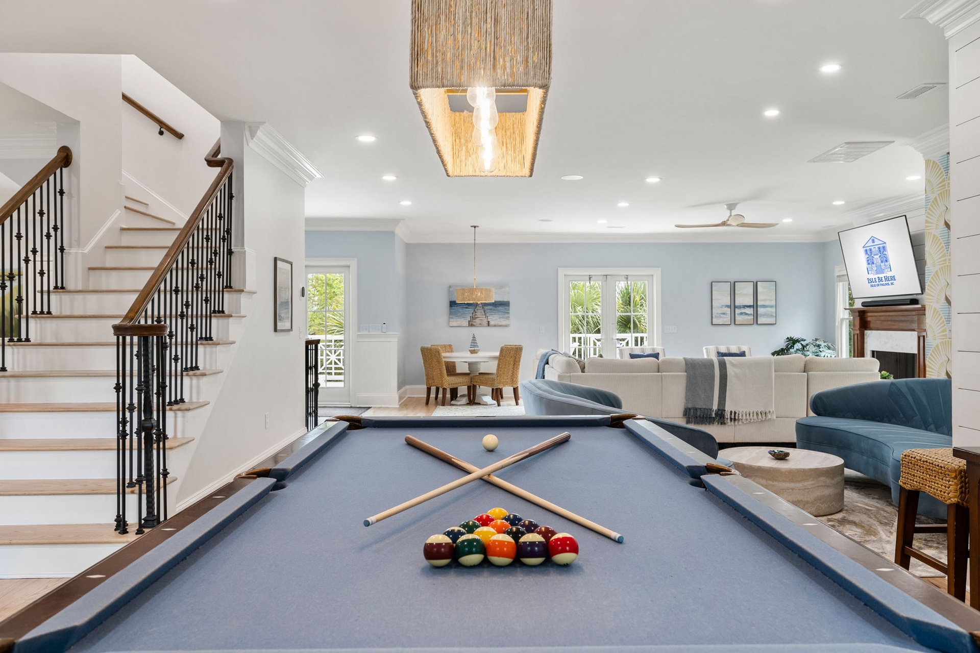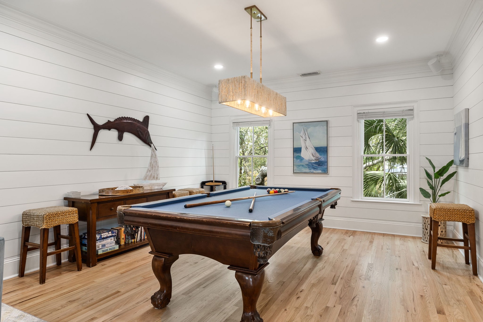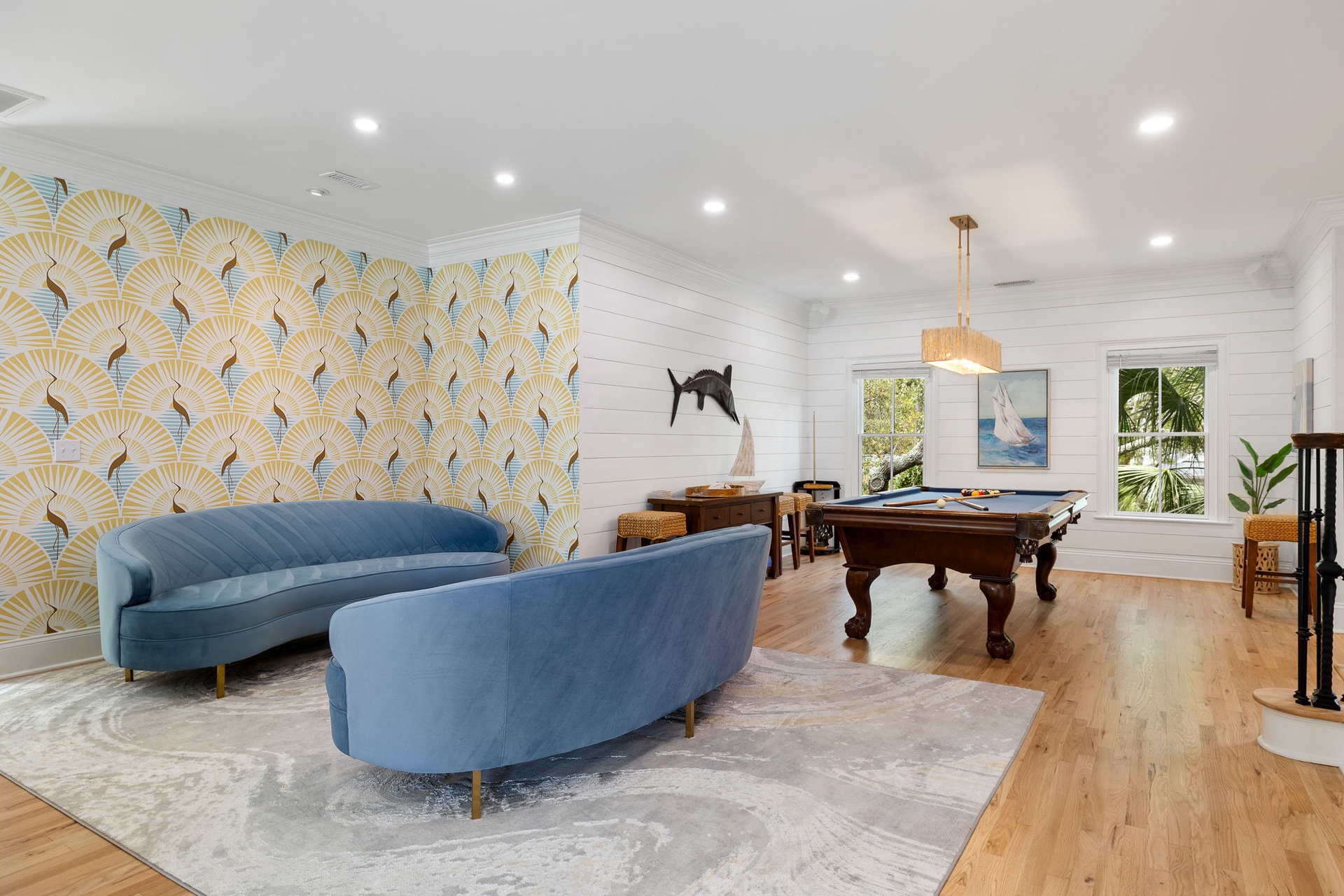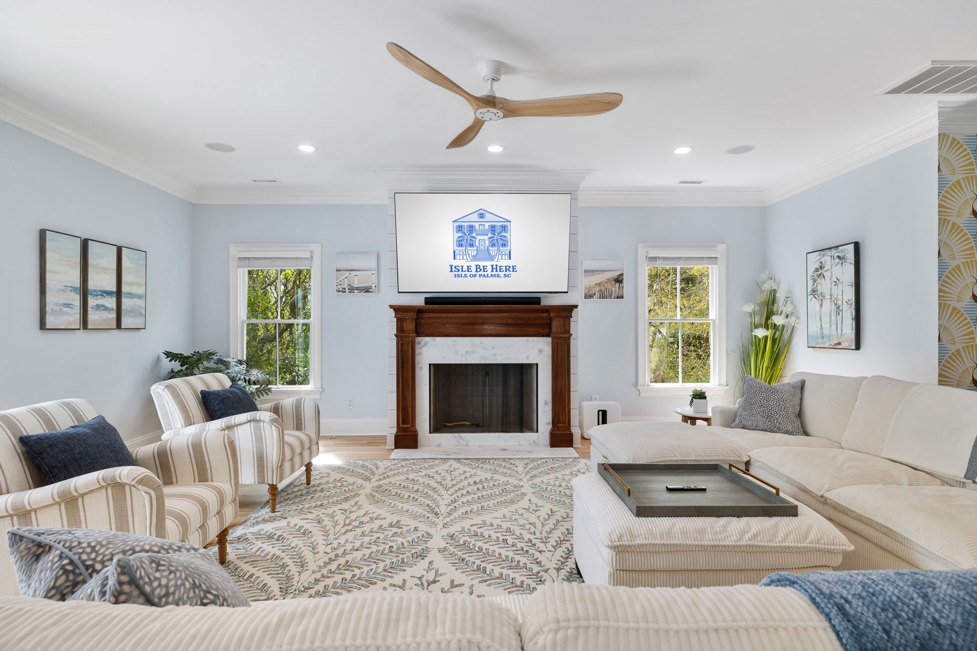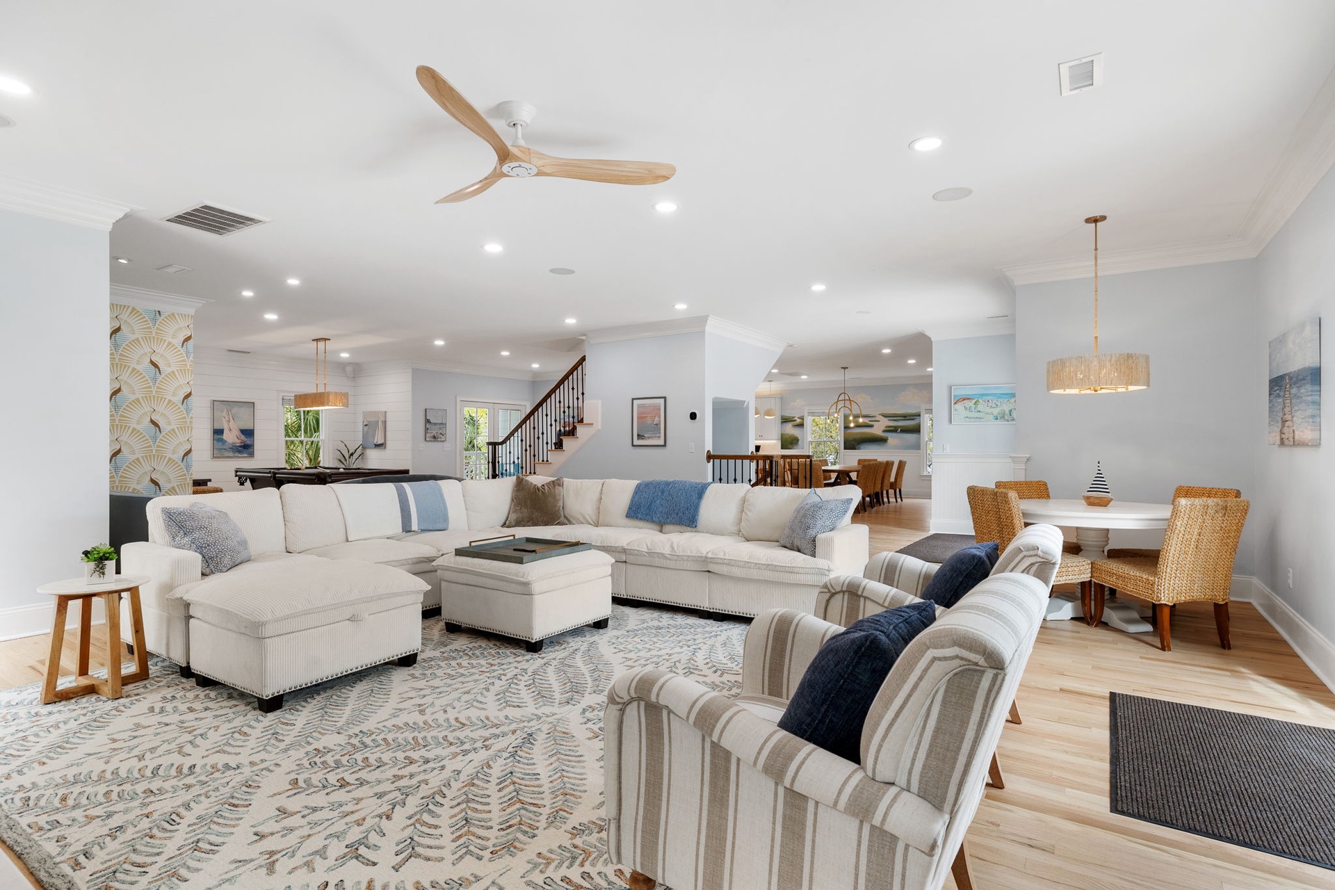 At the heart of the home, a stunning kitchen with marble countertops opens into expansive dining and living areas, anchored by a hand-painted Lowcountry mural inspired by the marsh landscapes of the island. Every space is designed to feel both connected and comfortably spacious.
