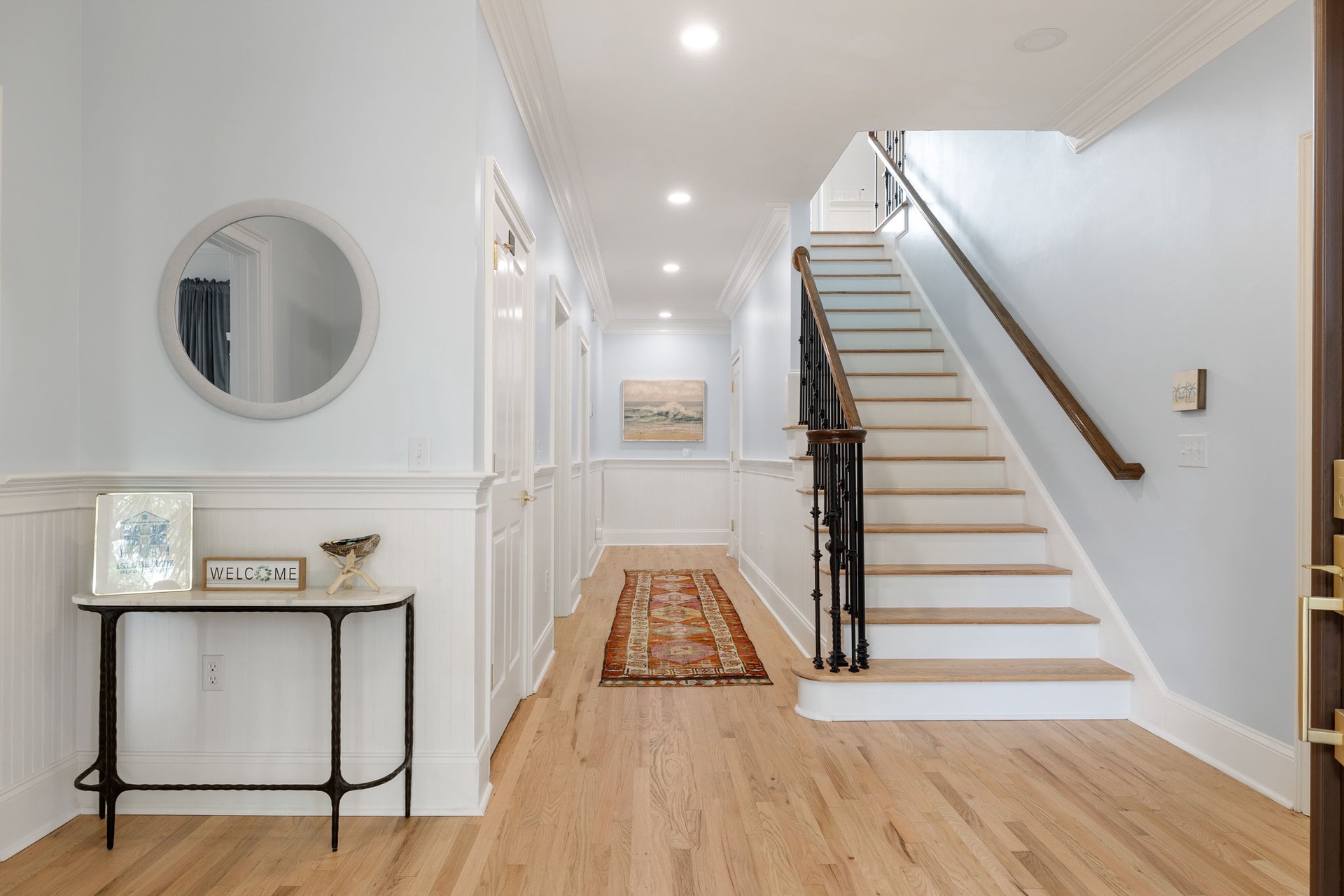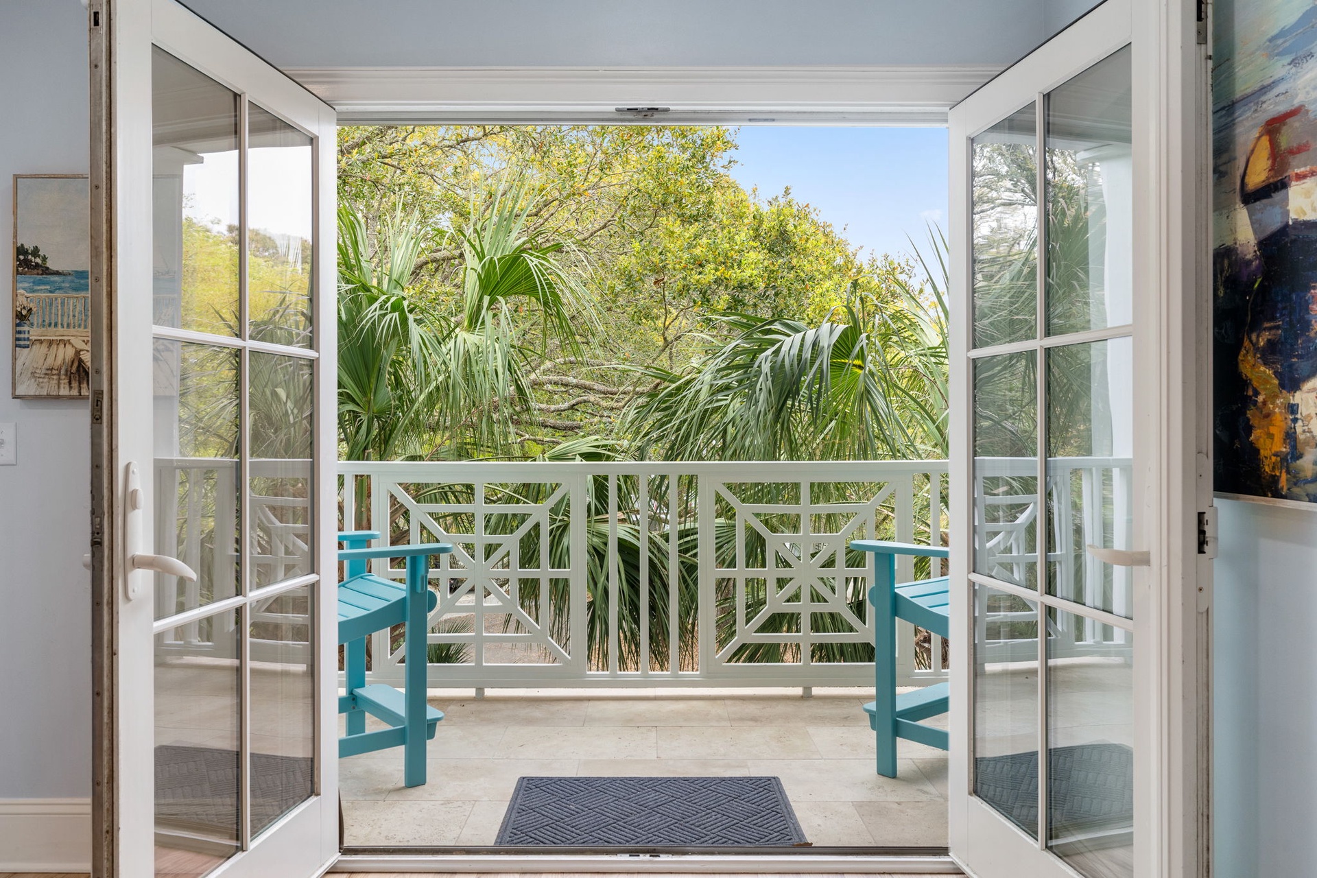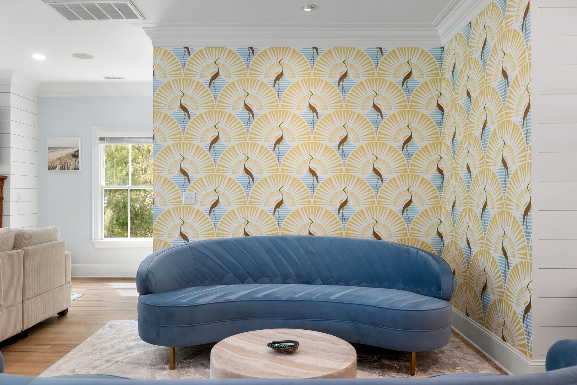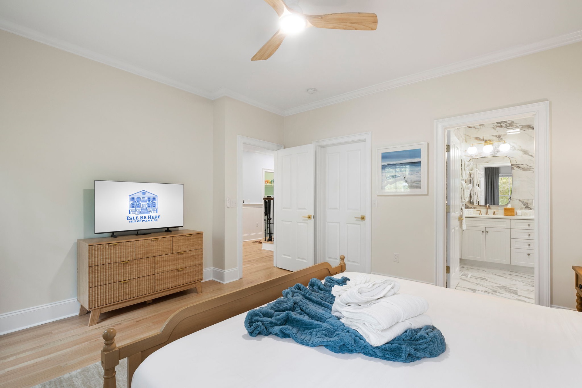 At the heart of the home, a stunning kitchen with marble countertops opens into expansive dining and living areas, anchored by a hand-painted Lowcountry mural inspired by the marsh landscapes of the island. Every space is designed to feel both connected and comfortably spacious.