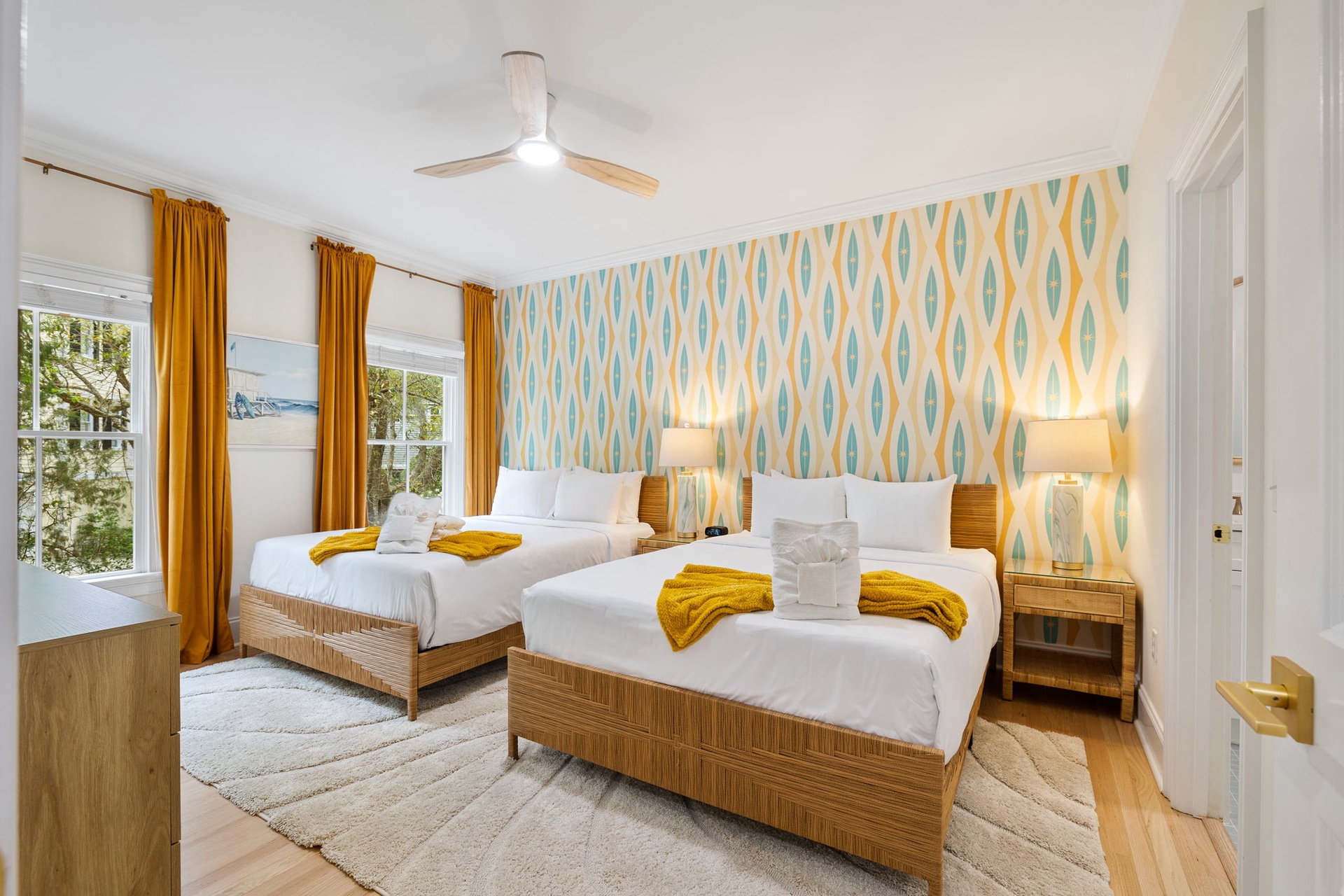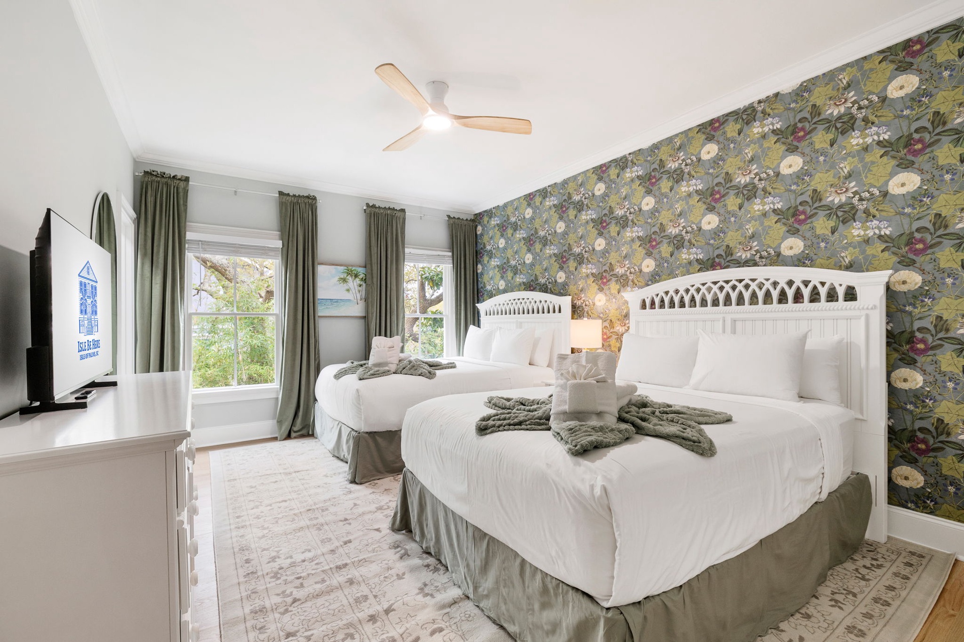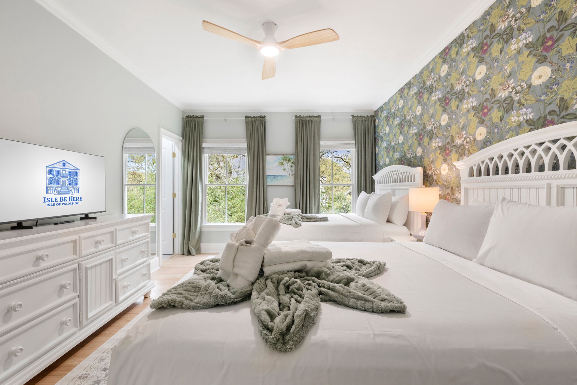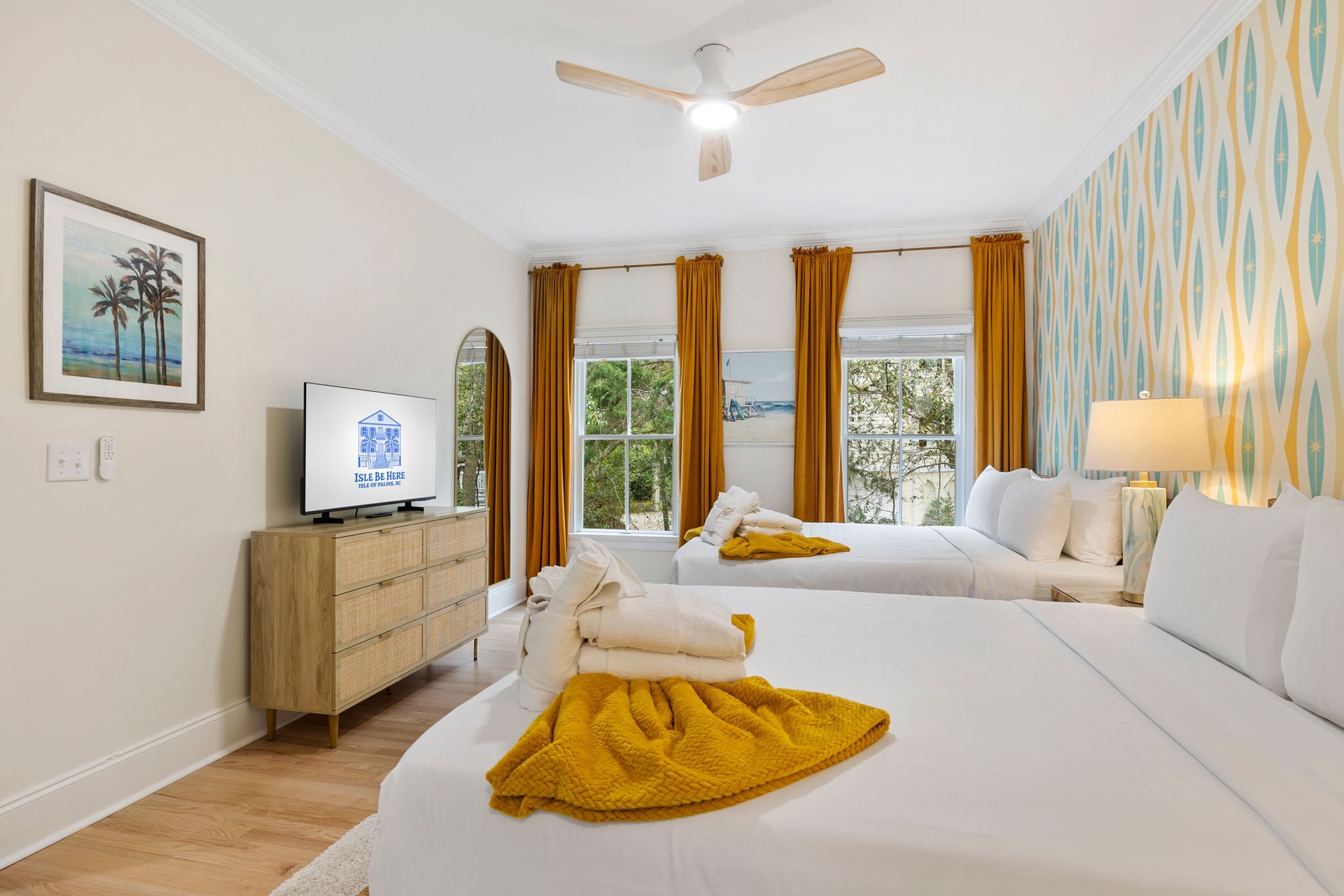 Each of the seven bedrooms features a private en-suite bathroom, creating a boutique-style experience with names and designs inspired by coastal living: Lowcountry Luxe, Passiflora Paradise, Starry Skies, Royal Palm, Sunrise Surfer, Isle Oasis, and Ocean Palms.