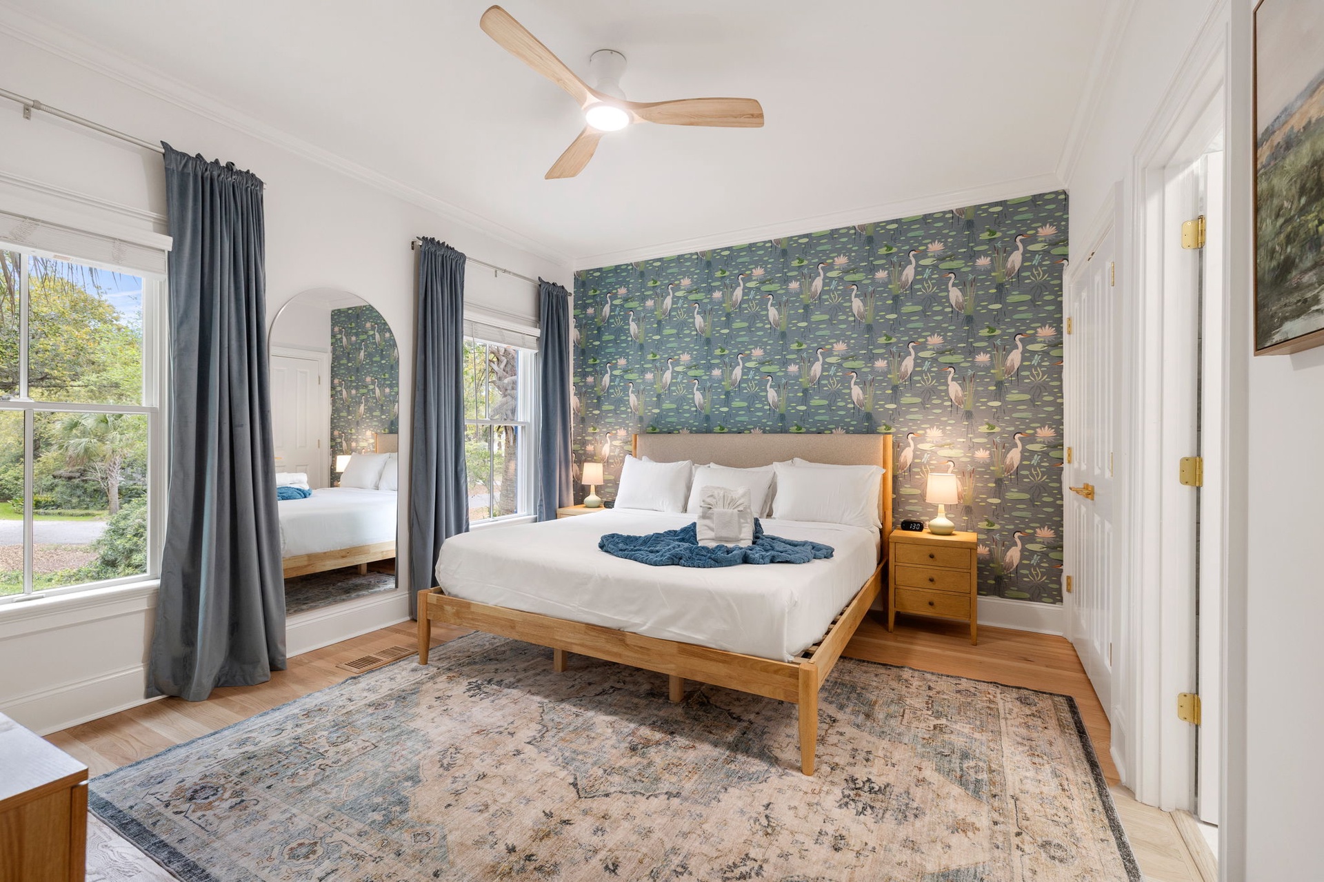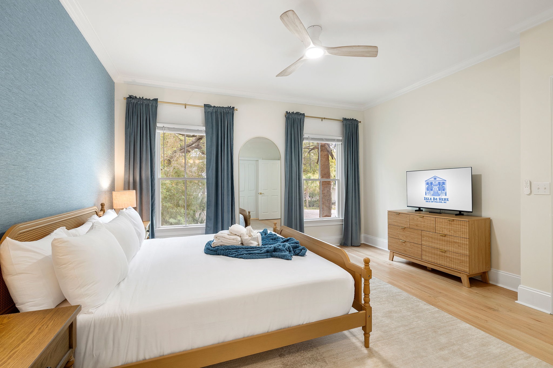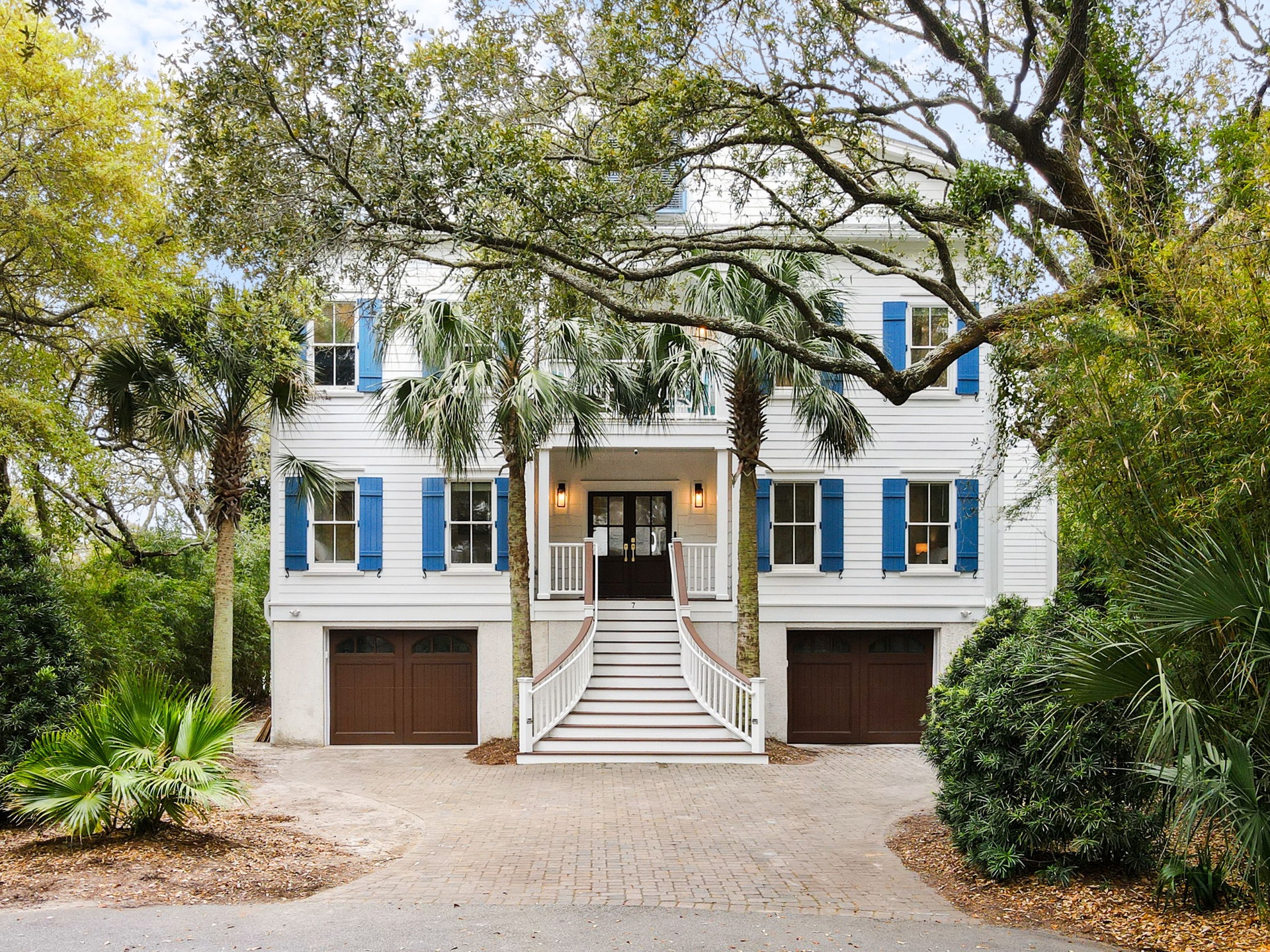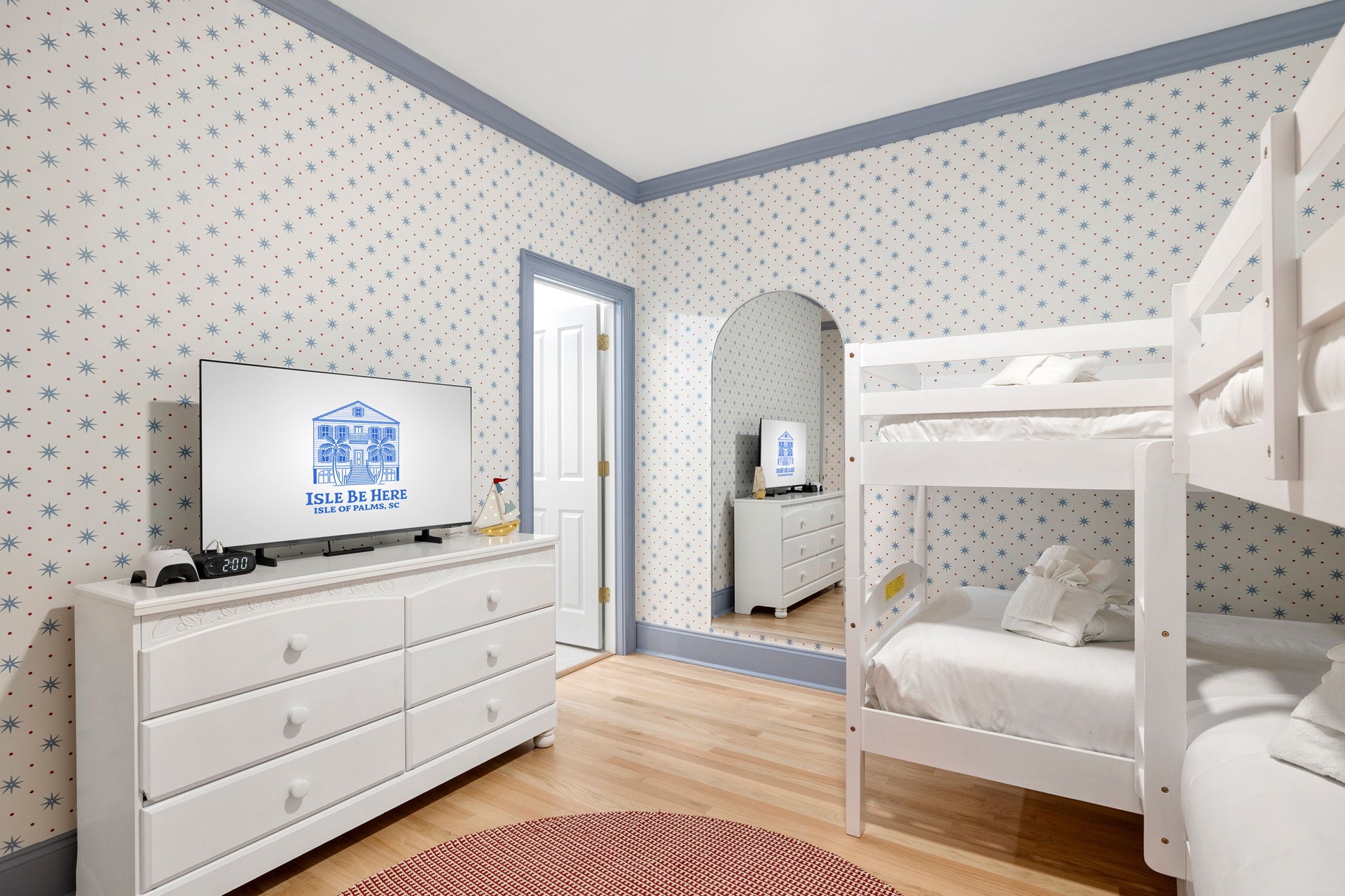 Each of the seven bedrooms features a private en-suite bathroom, creating a boutique-style experience with names and designs inspired by coastal living: Lowcountry Luxe, Passiflora Paradise, Starry Skies, Royal Palm, Sunrise Surfer, Isle Oasis, and Ocean Palms.