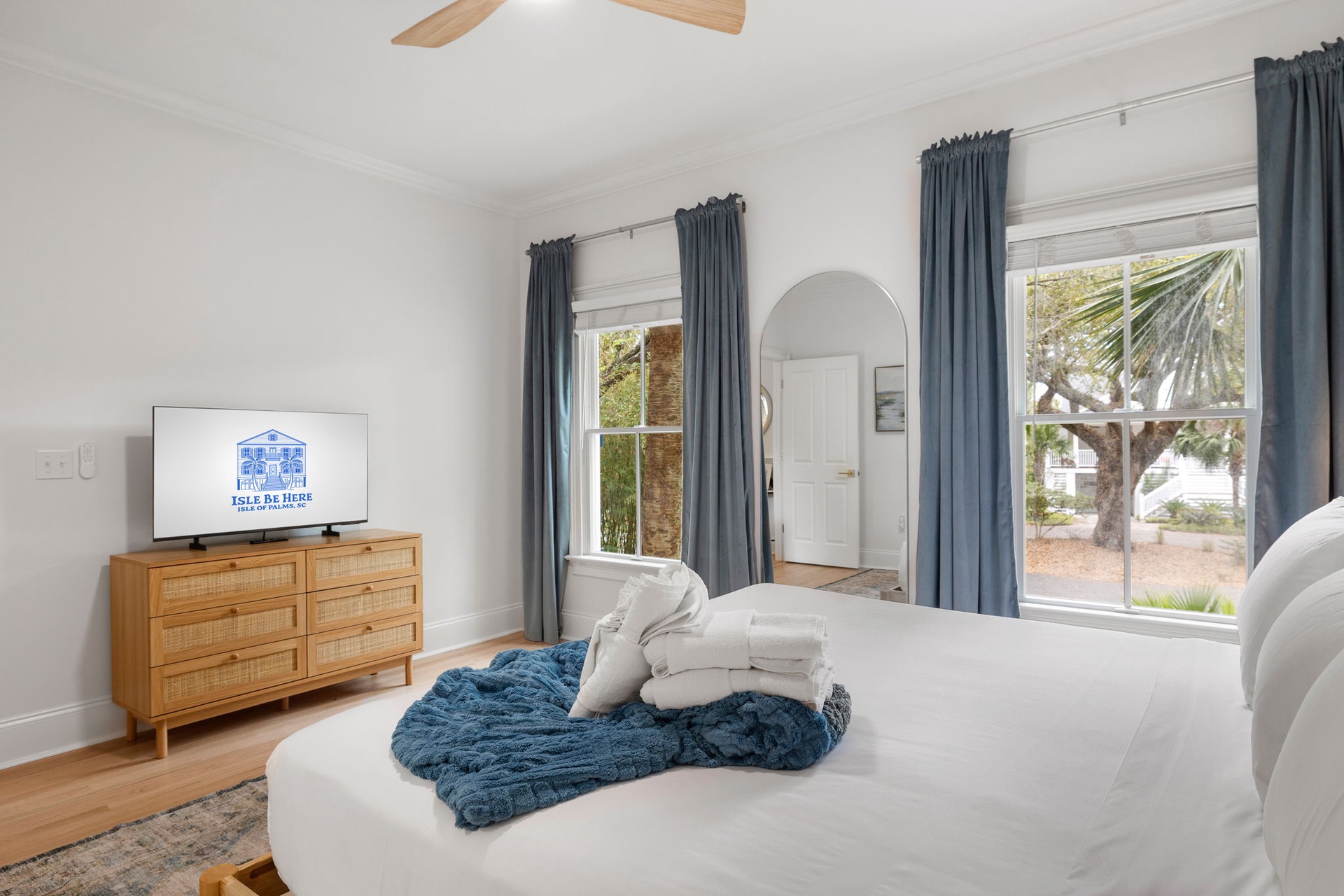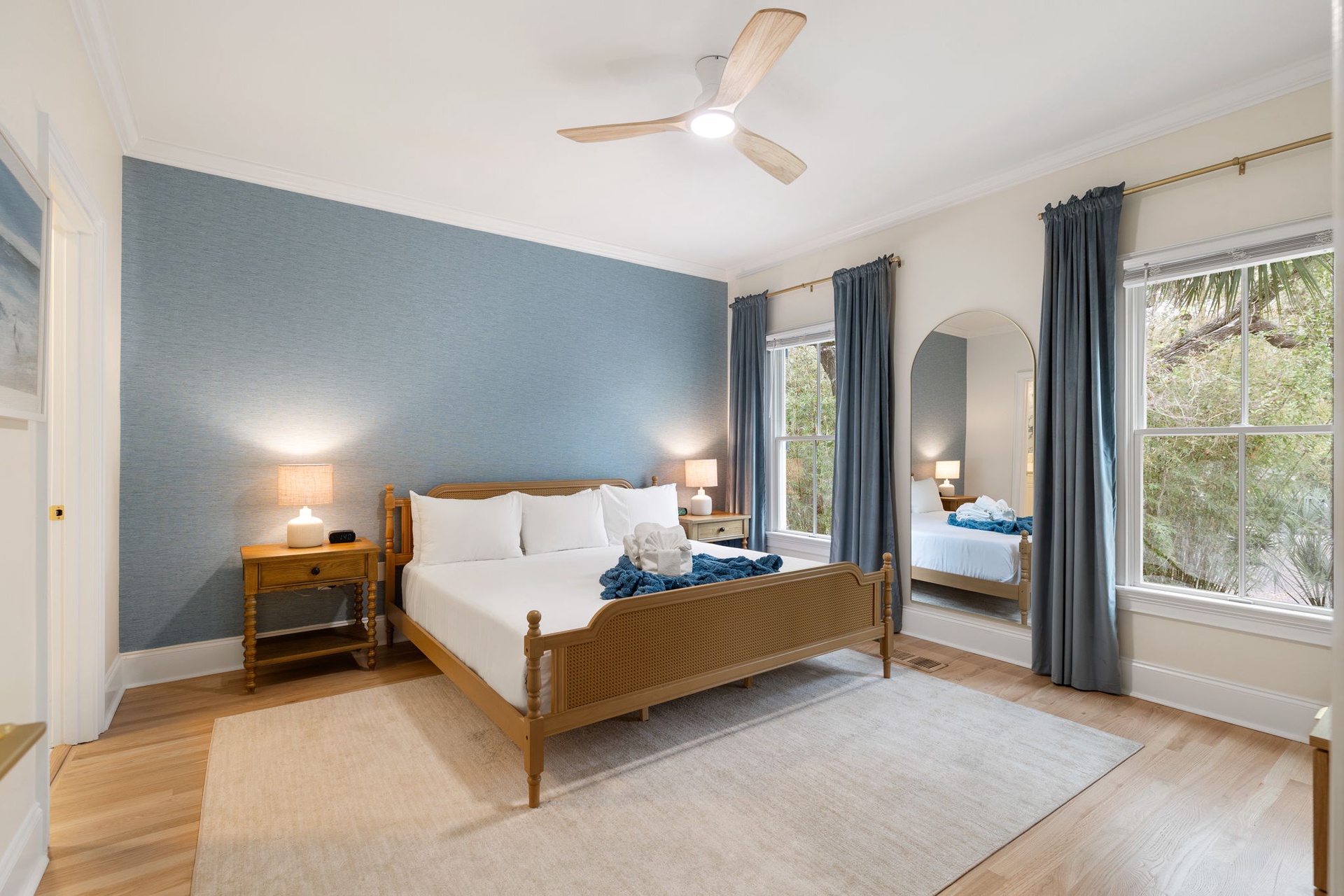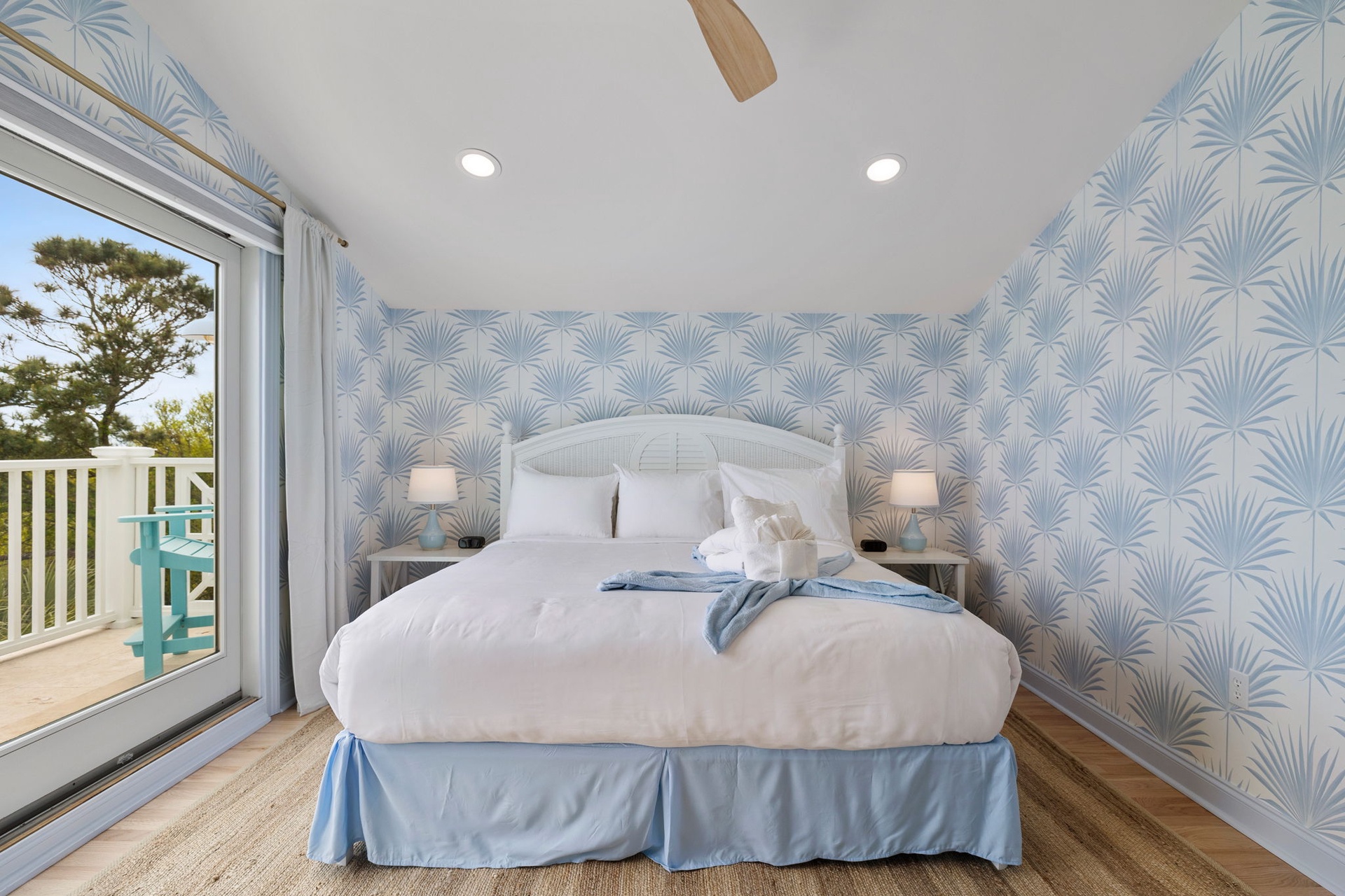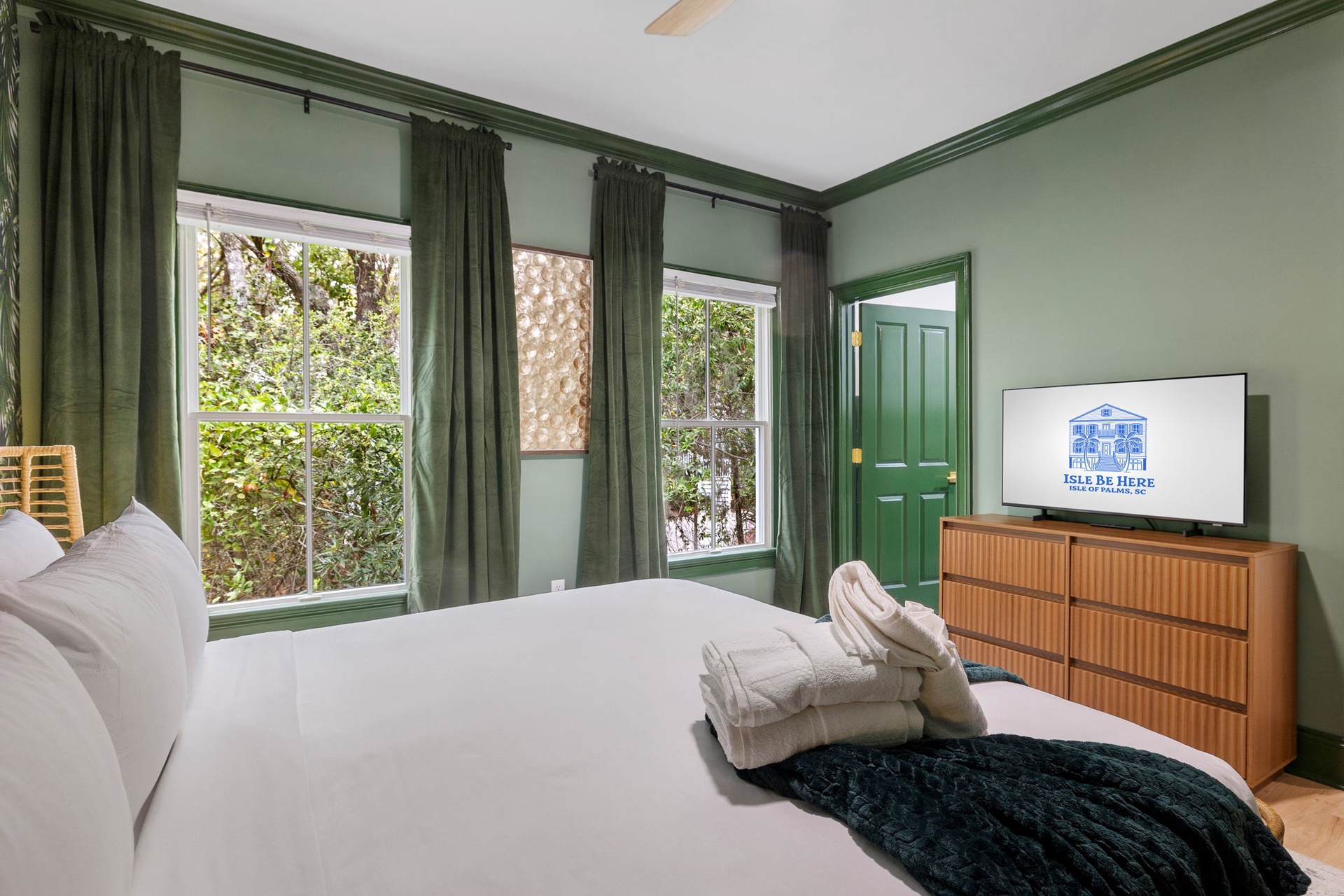 Each of the seven bedrooms features a private en-suite bathroom, creating a boutique-style experience with names and designs inspired by coastal living: Lowcountry Luxe, Passiflora Paradise, Starry Skies, Royal Palm, Sunrise Surfer, Isle Oasis, and Ocean Palms.