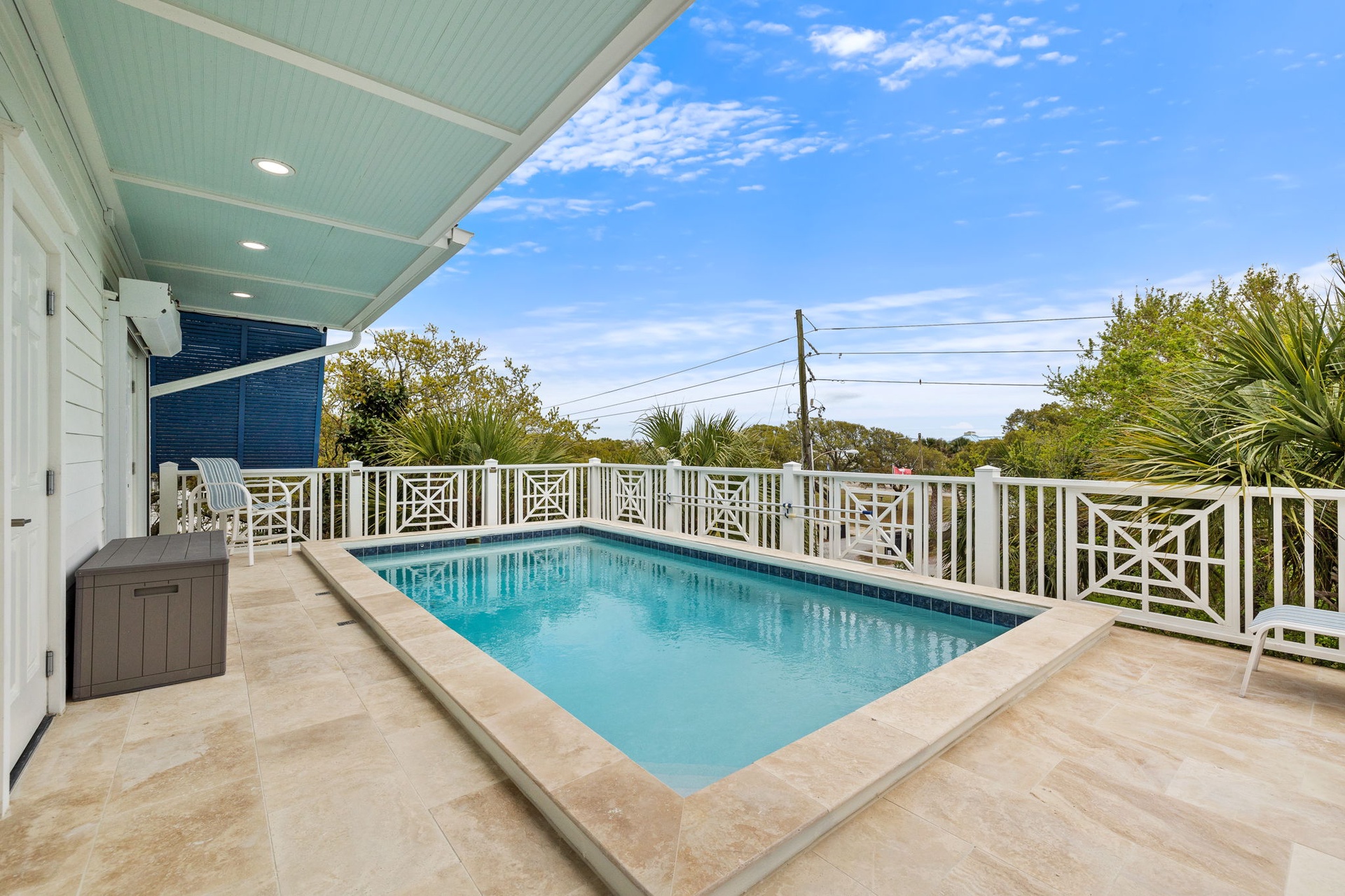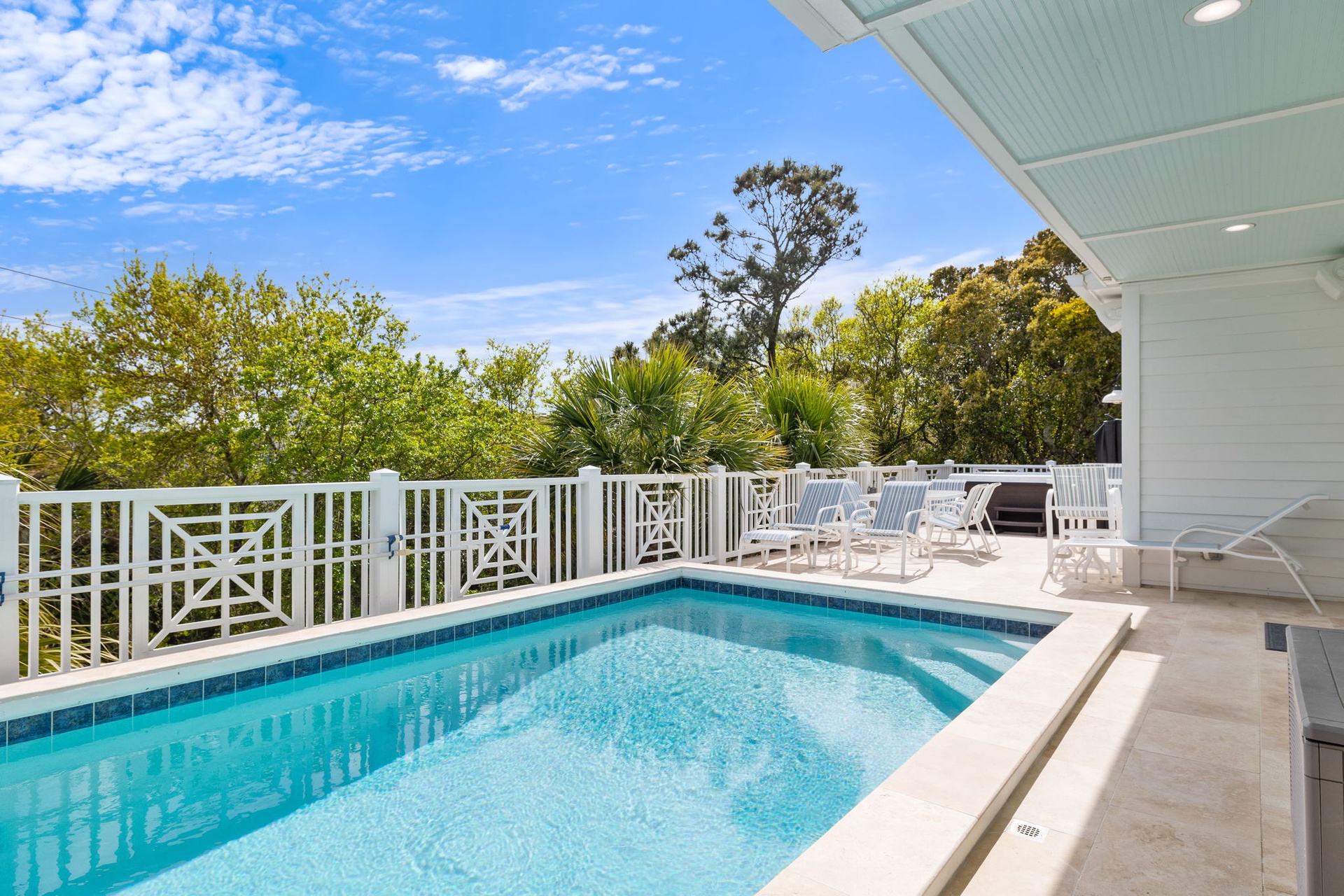 • Travertine pool deck and outdoor lounging areas
